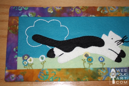 3] Using photos as a guide, position cat and mouse on the 6" x 18" piece of felt. There is no template for the exact positioning of the cat and mouse. There will be 1/2" seam around the entire piece of felt so do not position the cat, mouse or flowers in the seam allowance. Using the patterns as a guide, applique the cat and mouse to the banner. Note: do not add flowers or clouds until the border has been sewn on.) (Sorry, no photo of only the cat, mouse and banner. Use this completed banner for placement ideas.)