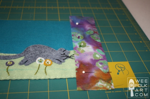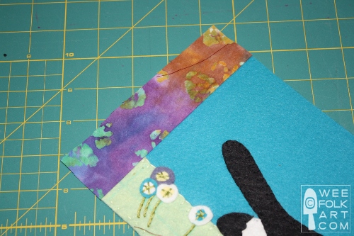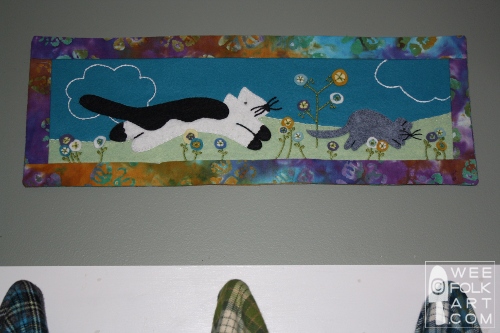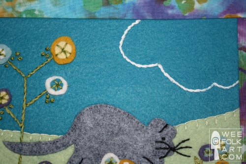 2] Cut out cat and mouse using patterns as a guide. To make the grass, simply draw a wavy line down the length of the 3 1/2" x 18" piece of green wool felt which is being used for the grass, mimicking rolling hills, cut it out along this line. Using 3 strands of floss, blanket stitch the grass to the banner along the wavy hill edge. Sew the grass to the banner along the remaining 3 sides close to the edge using a running stitch. The running stitch will become part of the seam allowance. (Sorry, no photo of the grass by itself, but use this photo for ideas.)
