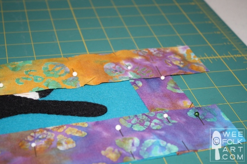 4] To add the border, cut strips of fabric 2" wide. Pin a strip of border to both short ends of the felt banner, with right sides together. Allow the strips to overhang a little. Sew border to banner using a 1/2" seam.