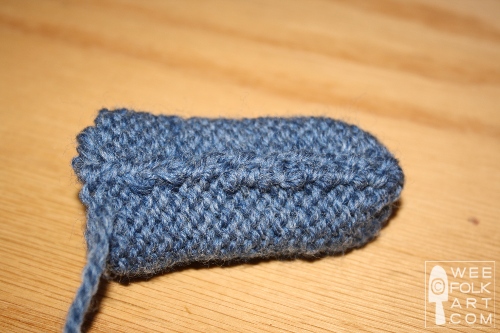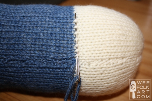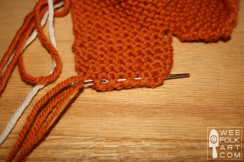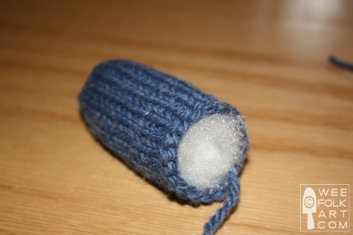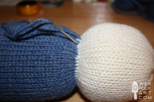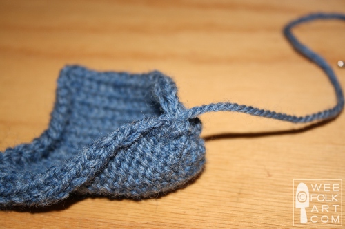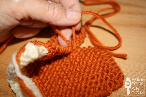 Thread a yarn tail at the bottom of a leg and sew a close running stitch across the bottom of a leg.