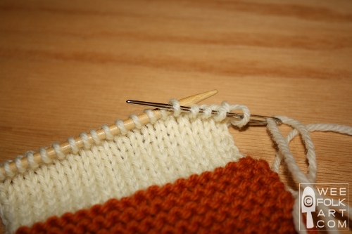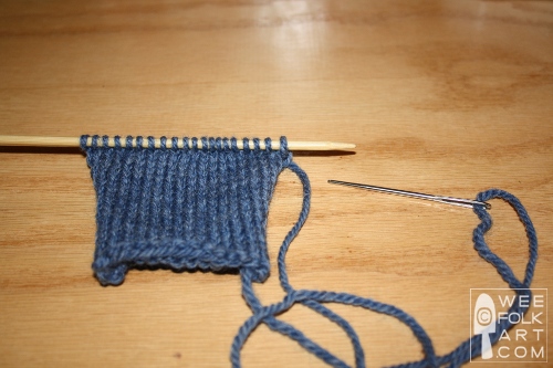 Thread the end through a yarn needle. Slide the needle through each stitch as you remove them from the knitting needle. Later, this will be pulled tight to gather the stitches.