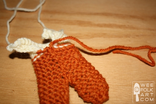 Pull the thread tight, gathering the leg edge. Tie off but do not cut yarn.