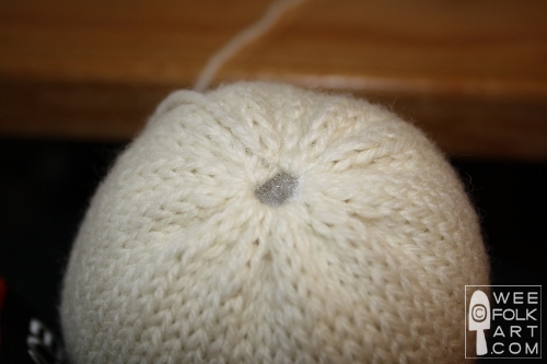 Pull the yarn tail at the top of the head that was slipped through the stitches. By pulling it tightly, you will gather the top of the doll’s head. The knit head should be wrinkle free. If you have wrinkles around the top of the head, try adding a little more stuffing. When satisfied, tie it off. Note: On the larger dolls you might create a “hole” in the top of the head. If so, simply sew the hole closed by making little stitches across the hole.