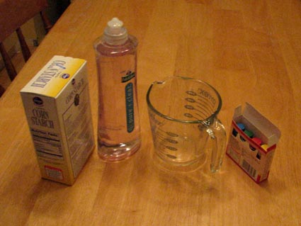 Mix slowly mix in corn starch to dish washing soap until you get the right finger paint texture. It should be thick enough to not be drippy. Divide into separate containers (you can use ice cub tray for small amounts of lots of colors). Add food coloring to get desired colors.