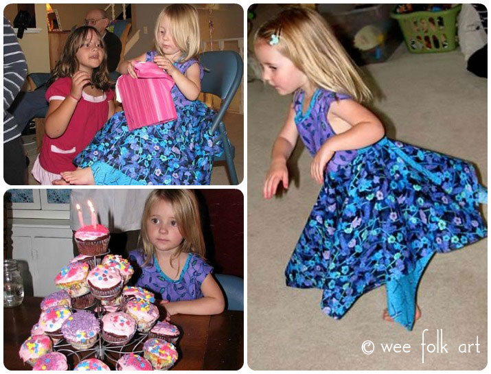 One thing to note though is the dress. The dress! This amazingly super twirly dress was made by Gammy for Pixie’s third birthday and has been worn by her for almost every birthday celebration since, along with numerous weddings. Gammy combined two different patterns, one for the bodice and one for the twirly skirt in making this dress. But I’m not quite sure how Pixie has pulled off 6 birthday celebrations in the same dress, considering how much she has grown. As you can see below it was a wee bit big the first year but there is something magical about this dress and it just continues to fit. Eventually we will need to re-purpose the dress to keep the tradition alive. I think there is enough fabric there to make a skirt for her tween years. I’ve also thought about turning it into a quilt but Pixie isn’t thrilled with that idea, at least not yet while the dress still fits. Does anyone have any other suggestions?