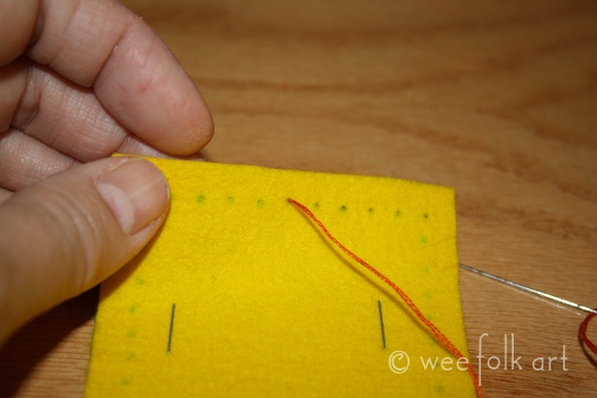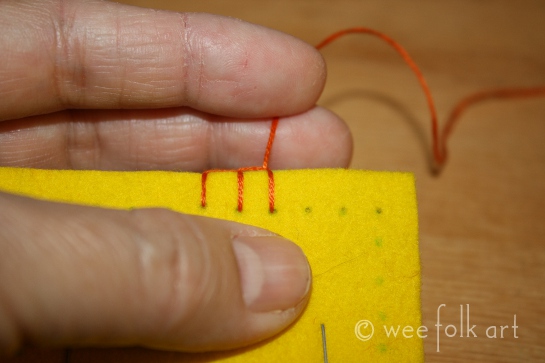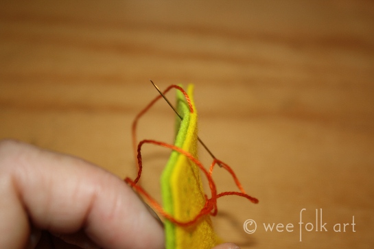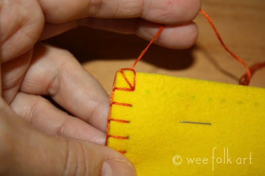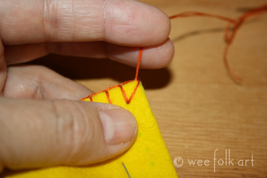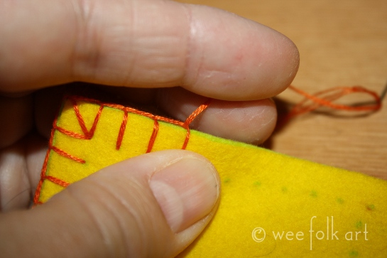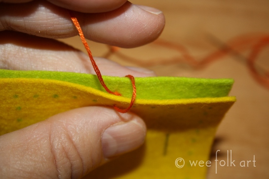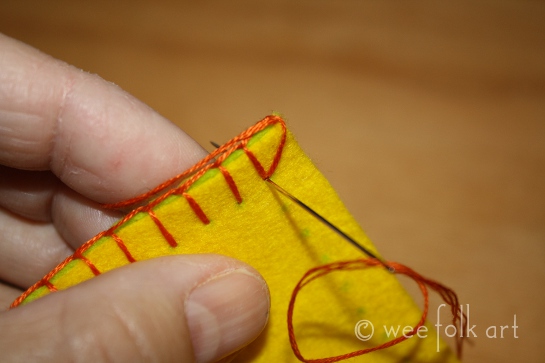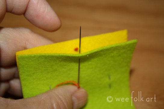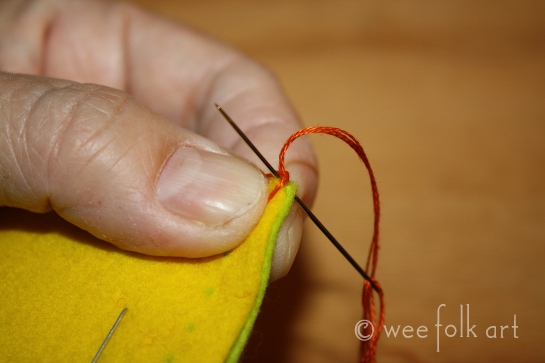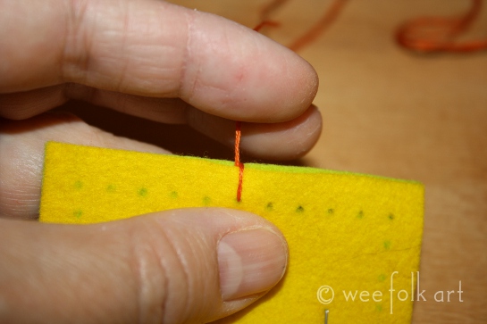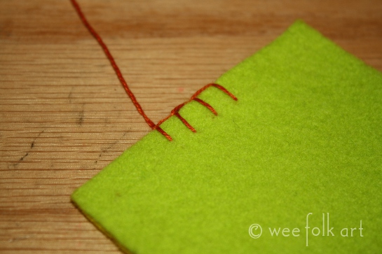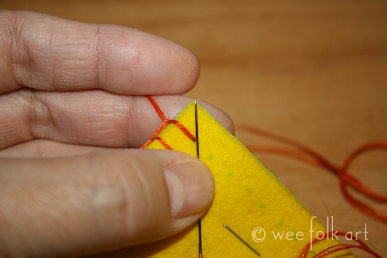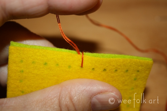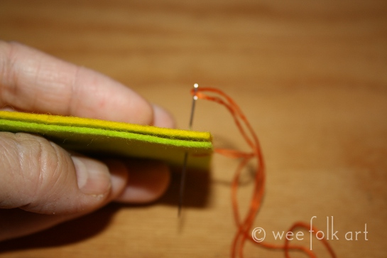 Continue stitching as explained in Part 2 which can be found HERE. When stitching, it is very important that your needle goes straight through the 2 pieces of felt. The needle should enter the felt at a right angle.