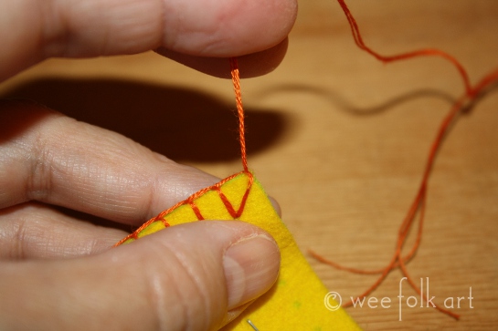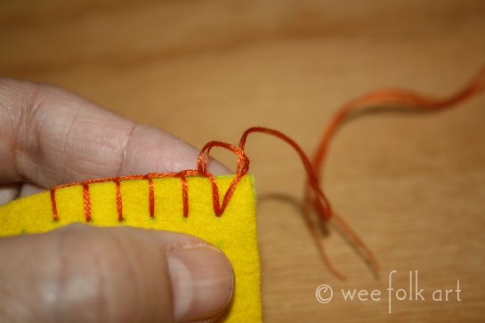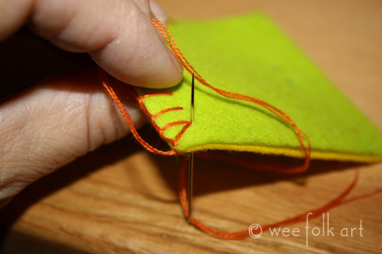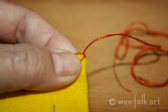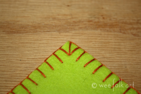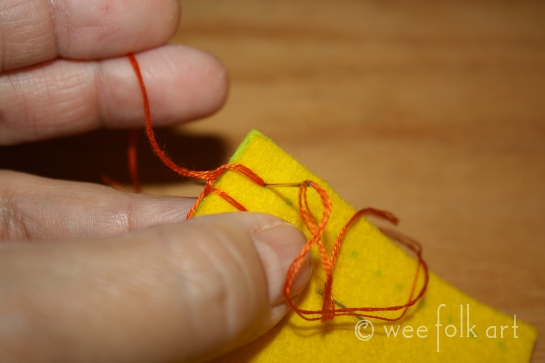 From the back side, insert the needle into a wee bit of felt near the tip, then slide the needle under the thread, bringing it through to the front. You have just created a small knot on the corner, and anchored it to a small bit of felt. This part is very important. Without grabbing a little piece of felt, the stitch can slide off the corner with use.