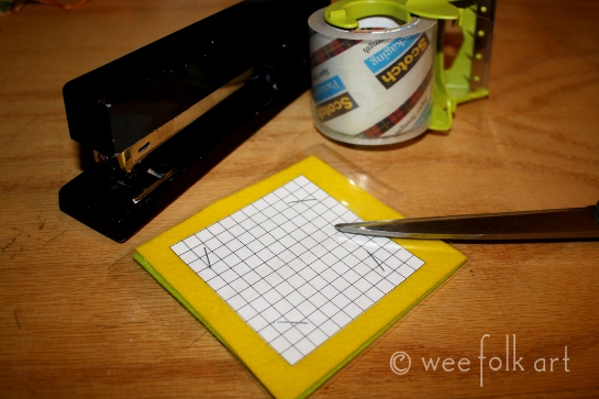 Cut out a piece of graph paper 3″ x 3″. (That is 12 squares by 12 squares.) Refer to our tutorial on how to cut out felt found HERE, and using the graph paper as your pattern piece, cut out two pieces of felt.