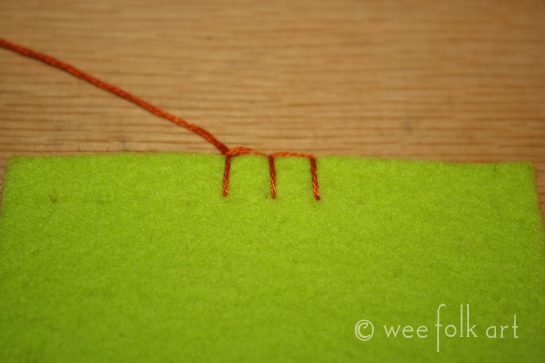 If you enter the felt on an angle, the stitches on the back will be smaller than the stitches on the front. In projects where the back of your work will be visible, it is very important to keep your stitch length consistent. In the photos below, the last stitch is the result of a needle entering the felt on an angle. NOT what we want to do 🙂