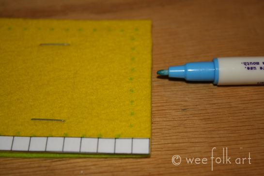 We will be using the yellow felt as the front in this demonstration. Set your grid marker on the edge on the front piece of felt, and using a disappearing marker, make a dot at each grid line. You will use these dots as a stitching guide. Because the squares have the same width and depth, your stitches will make little boxes. If you want smaller stitches, simply create a grid with more boxes per inch. Not only will your stitches be closer together, the stitch length will be shorter.