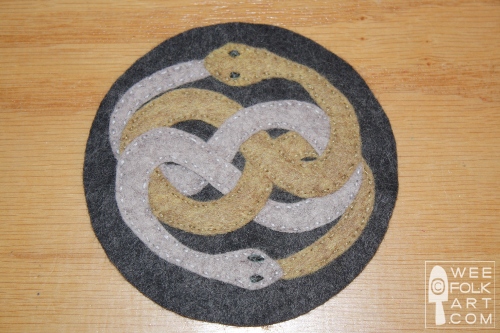 Position the snakes in the center of one of the felt circles. Pin in place. Stitch the snakes to the felt circle following the stitching lines on the pattern. Embroider eyes. (BTW… the pattern calls for a "stain stitch"… this should read "satin stitch"). Note: When cutting out the 2 large sections of the snake, you cut through the snake's body. This is necessary so you can intertwine the snakes. When sewing the snakes to the felt DO NOT sew along this edge because it is suppose to look like one continuous piece of snake. Instead, from the back side, tack this edge to the felt, making sure you do not go all the way through the snake. You do not want to see the stitching from the front but you want to make sure it lays down flat. Instead of tacking it from behind, you can put a little tab of fabric glue under this edge to hold it in place.