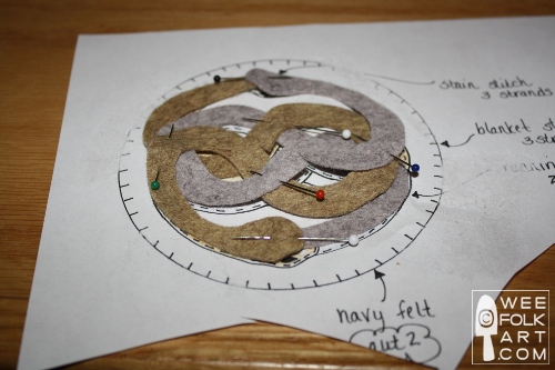 Using the pattern as a guide, place pieces on top of pattern, weaving them together following the pattern. Note: It is easier if you make 2 copies of the pattern; one to lay the pieces on and one to refer to for weaving the pieces correctly. Pin the felt together so it will not shift when you move it.