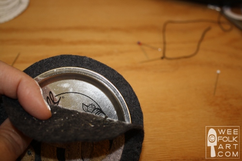 Slide the wide mouth Mason jar lid between the 2 circles. This will give it body. If you do not have a wide mouth Mason jar lid, cut a circle from a rigid piece of plastic (mayo or peanut butter jar lid will work). The circle needs to be smaller than the felt circles since you need to blanket stitch around the outer edge. Finish blanket stitching around the rest of the circles.