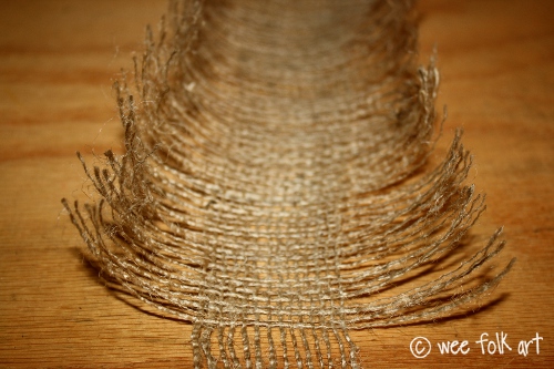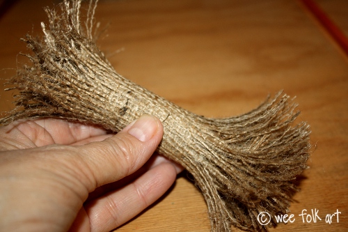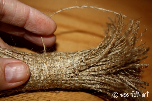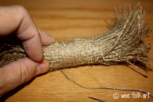 Using 1 of the threads that you unraveled from the burlap, overlap and end of the thread, and tightly wrap the 2″ center woven section.