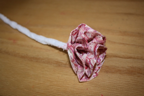 Follow the directions for the Rolled Calico Flower through step 7. Disregard all directions for the leaves unless you wish to add some to your stem. At this point your flower should be gathered and 9″ long. Proceed as follows: