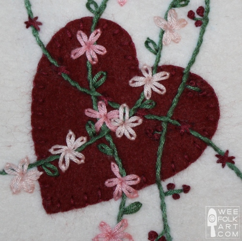 6] Going through all 3 layers of material, stem stitch the stems, use the lazy daisy stitch to make leaves, and add the flower heads using the woven spider wheel stitch.