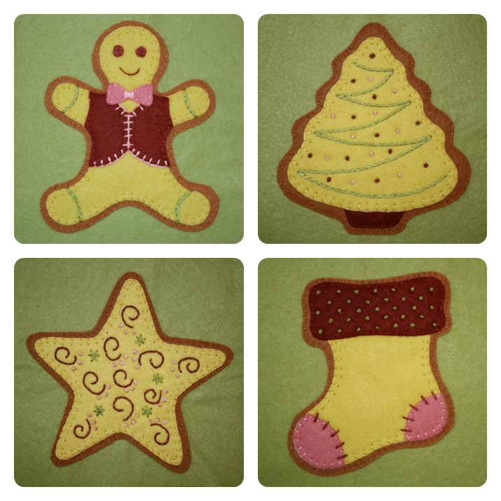 Our December Applique Blocks are a collection of gingerbread cookies that look good enough to eat! Besides using them as actual appliques, we thought they would make beautiful Christmas ornaments or could be turned into felt cookies for a wee one’s play kitchen.
