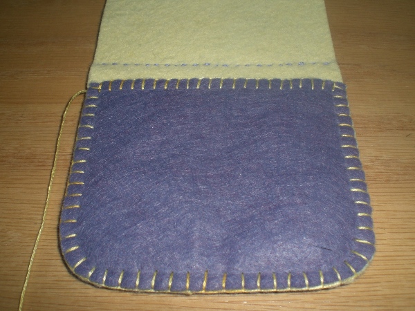 4] Place the front on top of the back with linings together lining up bottom and sides. Pin in place. Blanket stitch front to back using 3 strands of floss. Go all the way around the whole outside edge. This will attach the front to the back and sew the remaining back outside to the back lining. (At the bottom you will be going through 4 layers of felt. Make sure your needle goes straight down through the material to keep your stitches even on the back. Make sure your stitches are firm but not tight enough to start puckering the material. Also, it’s a good idea to reinforce the last blanket stitch on either side where the front edges attach to the back. (See pattern.) This is a stress point when placing things in the pouch and the reinforced stitch will help keep it together.