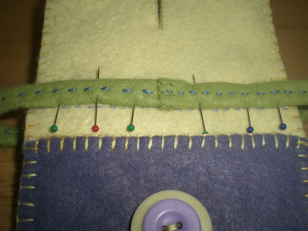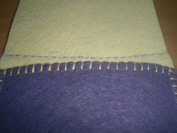 3] Place outside front on lining front. Pin in place and blanket stitch across upper straight edge using 3 strands of floss.