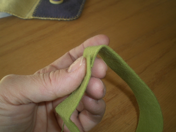 10] Fold the handle in thirds with the outer edge running down the center of the handle. Pin. Whip stitch the edge closed.