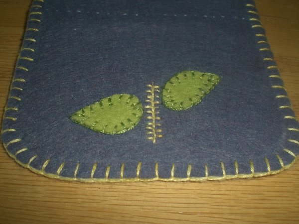 7] Using the pattern as a guide, pin leaves around the button hole. Use 3 strands of floss to blanket stitch the leaves in place. (Note: Be careful not to sew the pouch together on the inside while adding the leaves.)