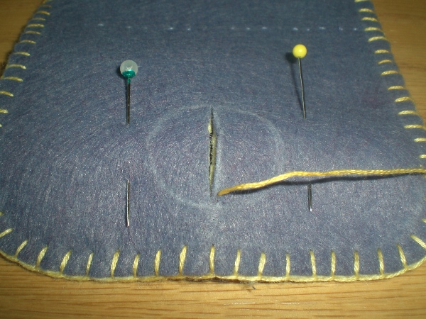 5] Using the pattern for placement and sharp scissors, cut a 1” slit (or the size of your largest button) for the button hole. You will be cutting through the outside and the lining together.