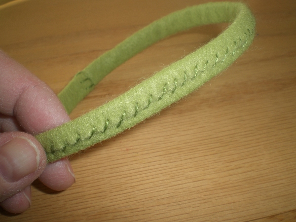 9] To make the handle overlap the 2 ends of the handle into a ring, being careful not to twist the fabric, and using 3 strands of floss blanket stitch the ends together.