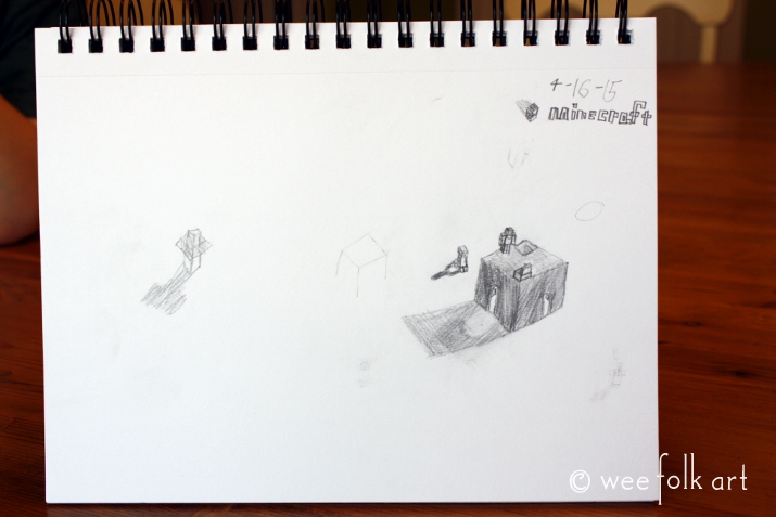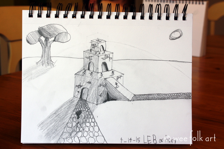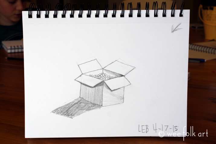 Last week in Lesson 4 :: Last week we began our study of cubes. The primary law of drawing we discussed was “foreshortening”. We learned to “squish” the top of our cube creating a 3-D affect. We also discussed “point of reference”, using the sides of the paper, and previously drawn lines, as a point of reference when drawing new parallel lines. Because of illness and spring vacation, it has been several weeks since our last lesson. To bridge the gap everyone was encouraged to take some of the concepts we have learning and apply them to their drawings. Below are some of our favorite drawings.