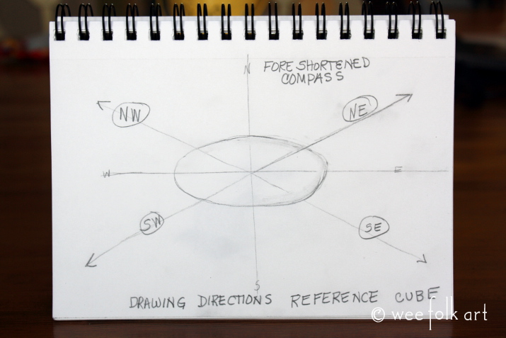 We discussed how most drawings do not use perpendicular lines, lines at 90 degree angles, but the angles tend to be “squished” or foreshortened. We all drew a foreshortened compass, or as Mark Kistler calls them, “Drawing Direction Reference Cubes”. This helps you position your lines consistently in proper alignment.