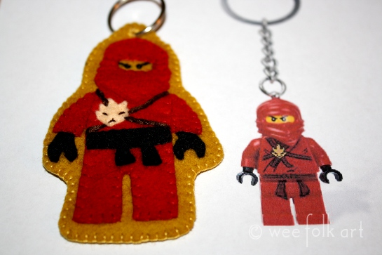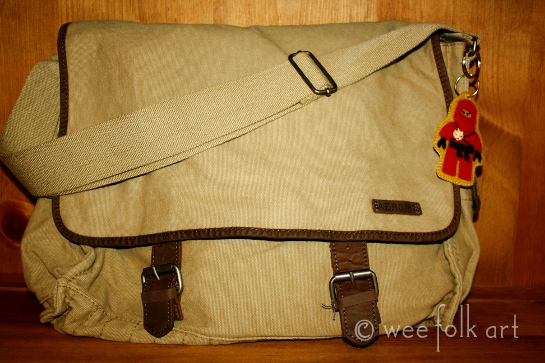 I woke up at 6:00 Monday morning with an idea. I must dream in crafts, because I often wake up with some scathingly brilliant or totally lame idea… my dreams don’t always transfer well to wakefulness! Anyway, I knew I wanted to add something to Bug’s Art Supply Messenger Bag, and somewhere in the night I decided to make a key chain of sorts instead of appliqueing a design on the bag. It didn’t take me long to decide what I wanted to make. Bug Loves Legos, and is currently into the Ninjagos.
