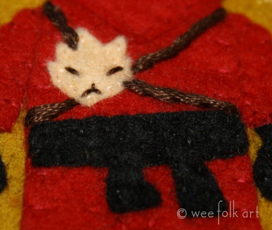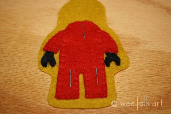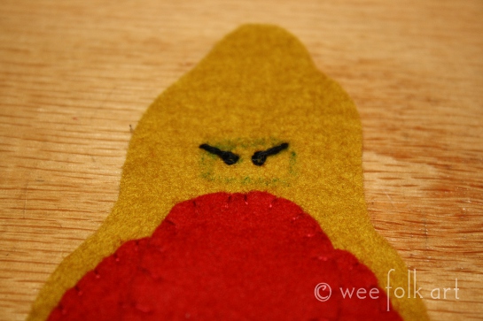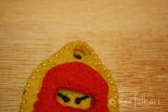 Add the chest detail: Add the belt, then the ties, using a running stitch and 2 strands of floss. Sew on the small face using a running stitch and 2 strands of floss. Add the eyes, nose and mouth using a straight stitch and 2 strands of floss. Using a stem stitch and 6 strands of floss, add the roping. (Note: I didn’t get a photo at this stage
