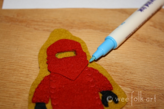 Position the hood on the body. Using a disappearing marker, mark the opening of the hood. Remove the hood, and draw on the eye brows and eyes using the pattern as a guide. Using a stem stitch and 3 strands of floss, embroider the eye brows. Using a detached chain stitch and 3 strands of floss, add eyes.