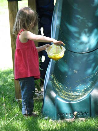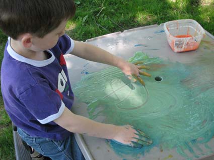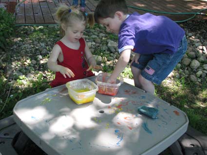 Today is just gorgeous outside and I wanted to get the kids out to do a big messy project. I was going to have them finger paint at their picnic table but it really needed a good cleaning since it has been outside all winter. Then the brilliant idea of using the bath tub paints we made in the past came to me.