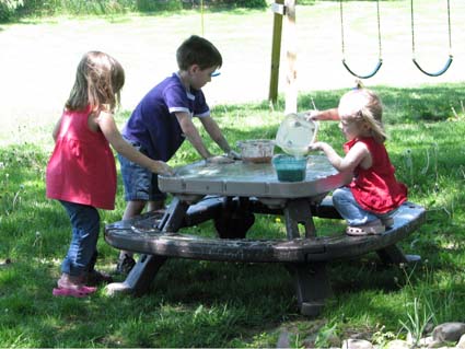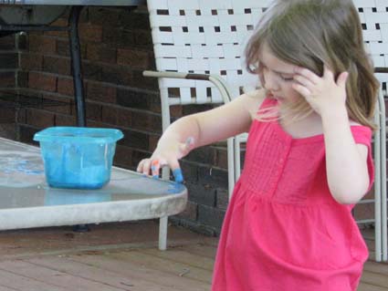 I mixed up a batch of bathtub finger paints and we headed outside to clean the picnic table. Not only did they have a blast finger painting, they practiced writing words in the paint (nice school tie in) and they cleaned everything in site! I followed along behind them with the hose set to power wash. Now everything on our deck is sparkly clean and ready for many hours enjoying the bbq.
