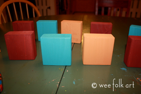 Paint all 6 sides of the blocks. Allow to dry completely. You should only need 1 coat of paint.