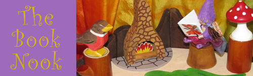 Well, as it turns out, we decided not to have a special banner. Michelle loves to point out that much of the work of any graphic artist never gets used. So, I apologized for wasting her time BUT isn’t the fairy reading a book about the cutest thing you ever saw? Well, I decided we needed to get more reading material into The Thicket. So I got busy, with the help of Britta, of course, and we created a stack of books, specifically for the children of The Thicket. The insides of the book can be left blank, as journals, you can use recycled text from magazines, or write your own story. You can learn more about making your own Gnome and Fairy Books HERE or with our FREE Patterns. Enjoy!