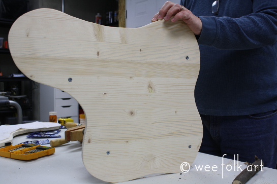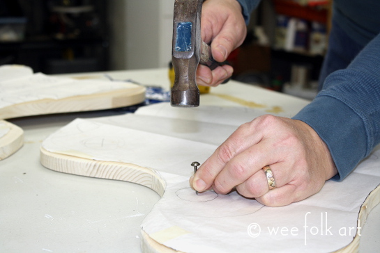 Place your pattern for the bottom platform on top of it. Using a screw or a nail, lightly tap the center of the circles designating the location of the branches. When you remove the pattern, there will be mark where the center of each branch will be screwed in.