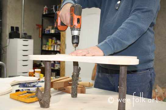 From the underside, mark the location of the branches on the second level by drawing a circle around the branch. Drill a pilot hole in the center of each of the branch markings.