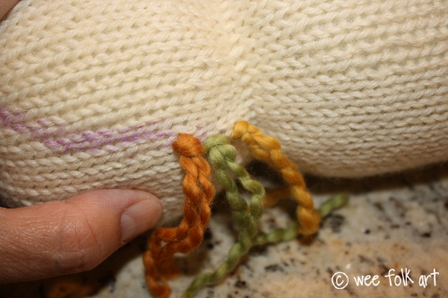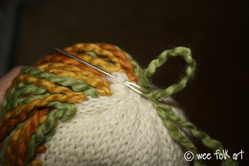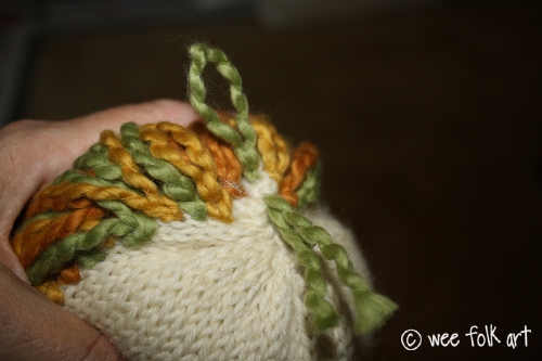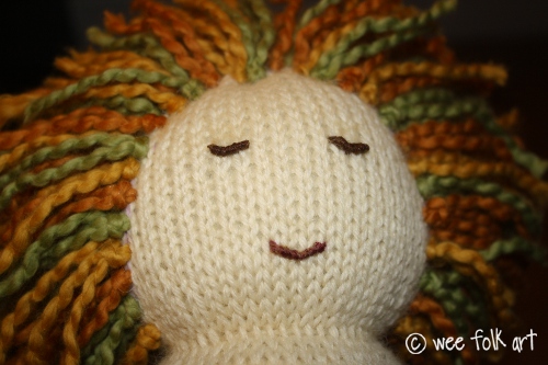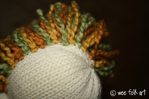 Hair, like the face itself, is how you personalize the doll. I chose to use a thick, natural organic yarn, but pick yarns and colors that suit your fancy. Also, I chose a very simple face, with little crescents suggesting eyes and mouth, but if you prefer a more detailed face, or chose to add no facial features at all, it as all a matter of choice. No matter how you decide to personalize your doll, here are the general instructions for adding the hair and facial features.