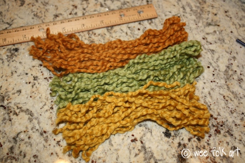 Cut yarns in desired length. I cut the yarn 4″ for the golden haired doll and 6″ for the rust/green haired doll. My next doll will have long hair and I think I will cut the yarns 20″ long!
