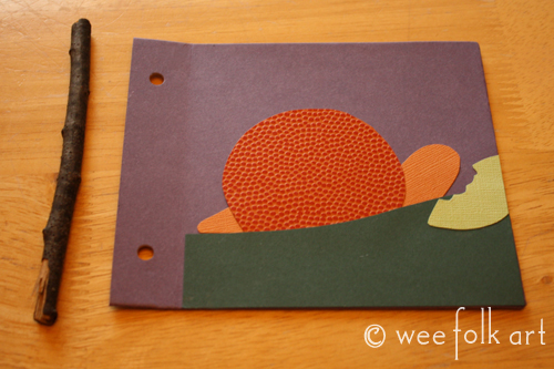 The Homemade Nature Journal is a great, eco-friendly project. You can use recycled materials for the covers, inside pages and elastic band. We used a cereal box, printer paper that had minimal printing on one side and a rubber band that came on our broccoli stems. The stick was found in our backyard. The only new materials we used were a few sheets of decorative scrapbooking paper, but you could use any left over scrap paper. Another thing we love about this journal is how it is bound. You can undo the binding and change out the center sheets of paper if you would like… reusing your cover pages again and again.