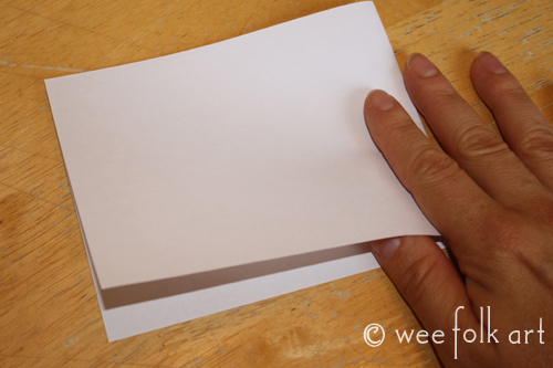 Take a sheet of 8.5″ x 11″ paper and cut it in half lengthwise creating a 4.25″ x 11″ piece of paper. You can reuse paper that has been printed on one side. Fold in half to 4.25″ x 5.5″ (printed side on the inside). Stack several sheets together. This will make the pages of your book. They will be double thick to help stop the stamp ink from bleeding through.