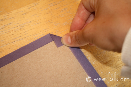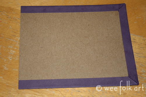 Decorate the cardboard with paper. To do this, cut a sheet of paper to 6″ x 6.5″. Glue the cardboard down in the center of the paper, wrong sides together, with one short side lined up, the three other sides with a 1/2” overlap. Fold the two corners of the paper in at a 45 degree angle over the cardboard. Glue the corners down.