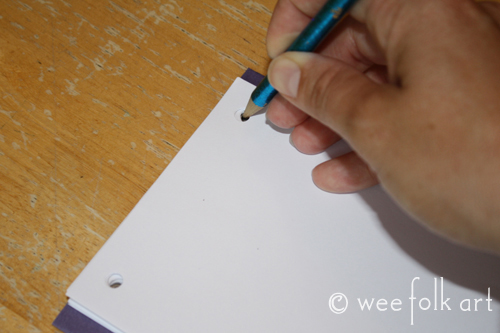 Punch holes in the open side 1/2” from the edges. If you have a lot of pages it will be difficult to punch through… so as long as you are careful lining up the edges you can just do a couple pages at a time.