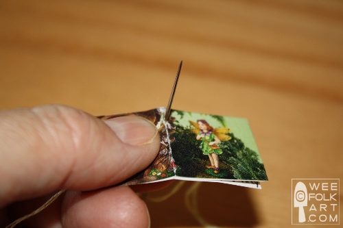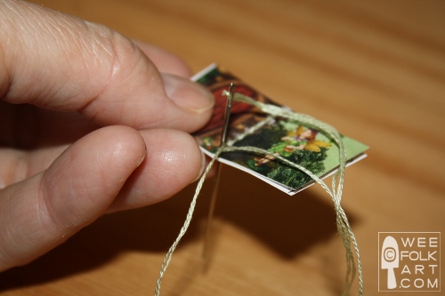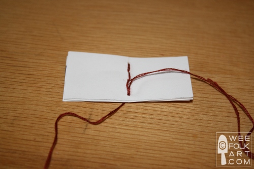 12] When you have finished your last hole, turn the book over so you are looking at the inside of the book. The thread will be sticking out of the last hole.