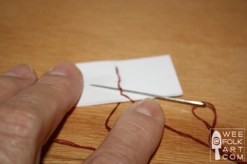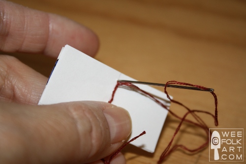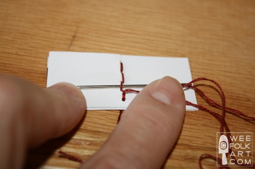 9] While hold the tail against the spine, bring the needle up through the 2nd hole, coming up to the right of the tail.