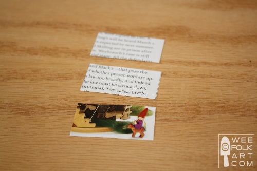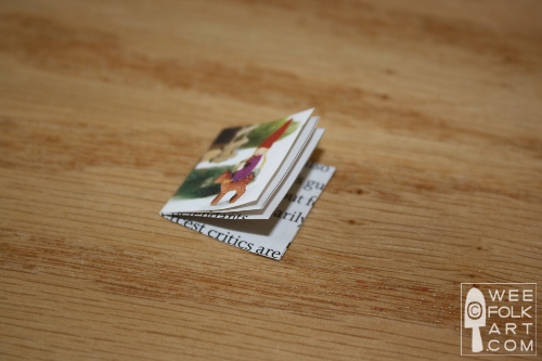 2] Cut out the cover horizontally, 1 3/4″ x 7/8″. Because the paper strip will be folded in half to make a book, make sure the desired “front cover” design is near the right edge of the strip. This way, when you fold the book in half, the picture will be on the front cover. Cut out two more strips of paper 1 3/4″ x 7/8″ for the inside of the book. You can either use text from old magazines or plain paper to leave as a journal or for writing a story in.