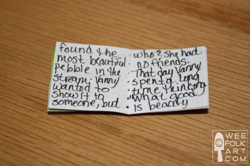 5] If you would like to write a story, I suggest you do it now, before you sew or staple the book together. This way, if you make a mistake, you don’t waste time or your outside cover. When writing in your book, may sure you keep it in the order it was when you folded the strips in half. Use a very fine tipped permanent marker and write small. For younger children, you may want them to dictate a story and you write it in the book. Just for an example, here is a very simple story I wrote to demonstate how much text you can actually fit into one of these books: