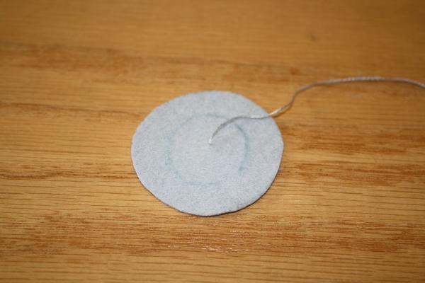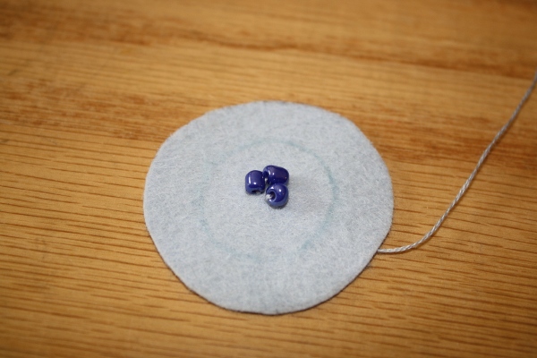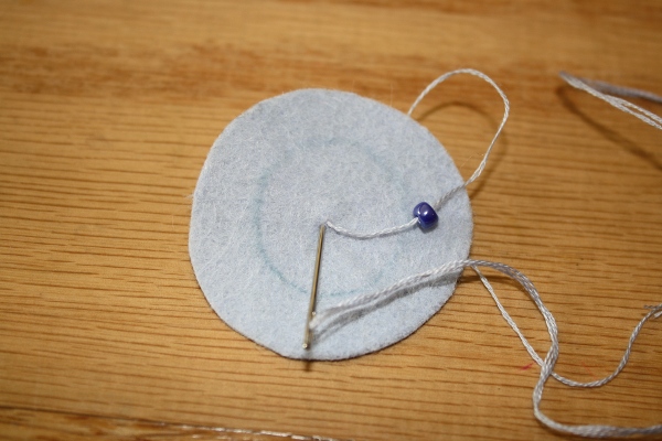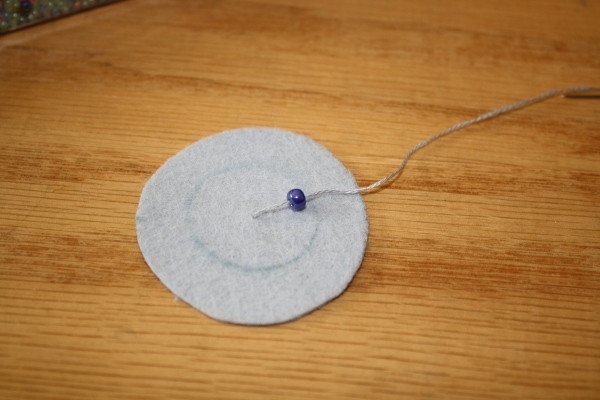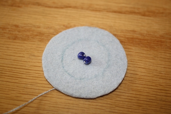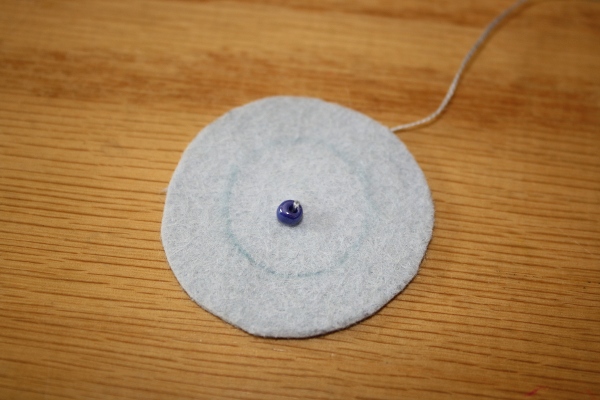 5] Placing the needle close to the spot where you brought your needle up through the fabric, sew back down through to the backside. Pull the bead close to the felt.