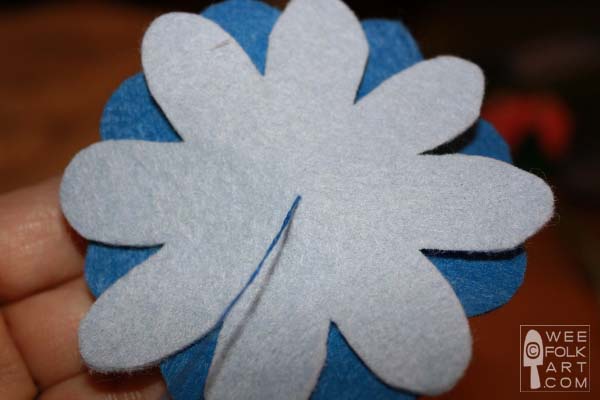 12] Place petal 2 on top of petal 1. Near the center, tack through petal 2 and 1. (Do not go through the leaves.) Attach securely. Make sure the petals are placed on top of one another in an appealing manner.
